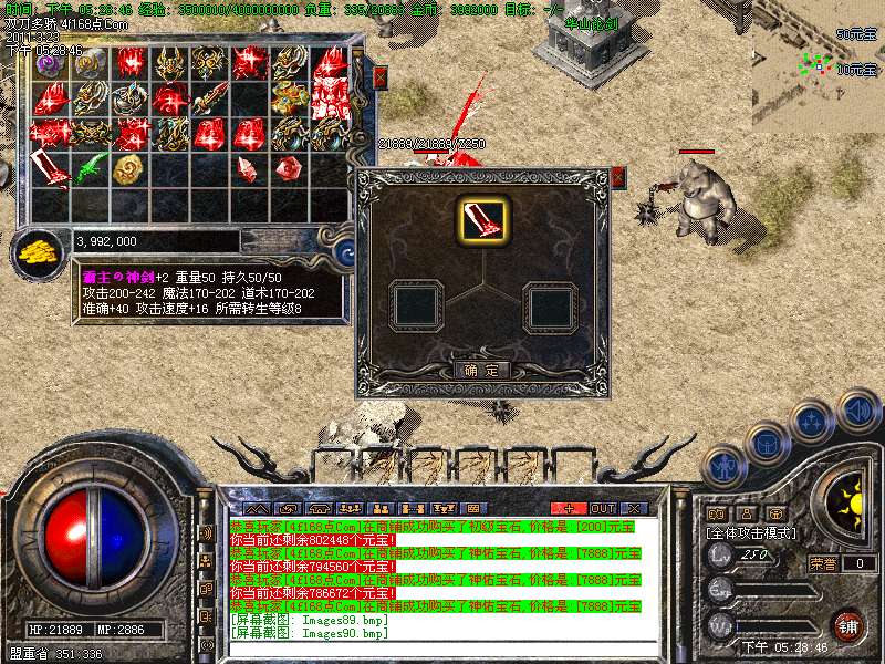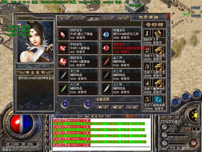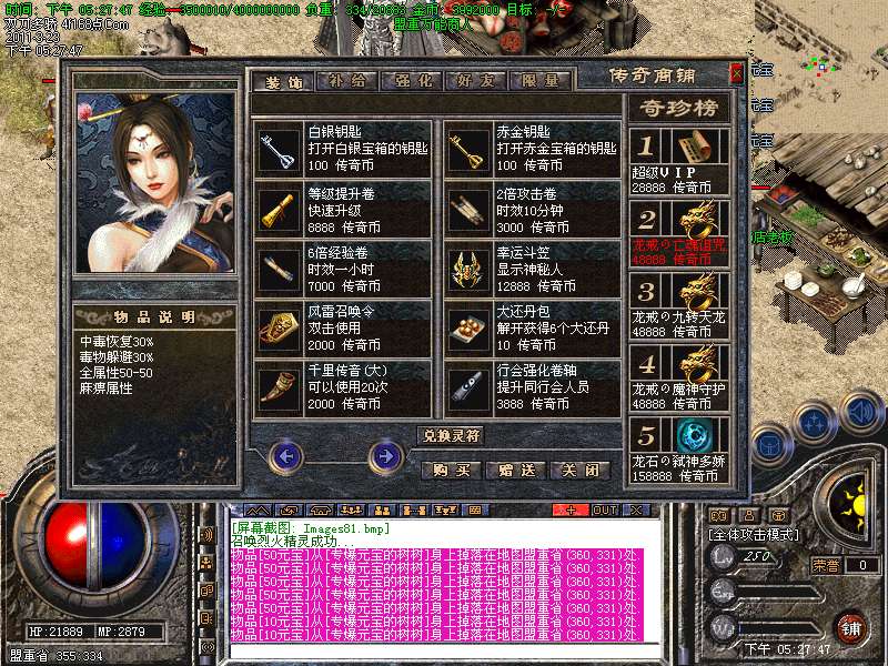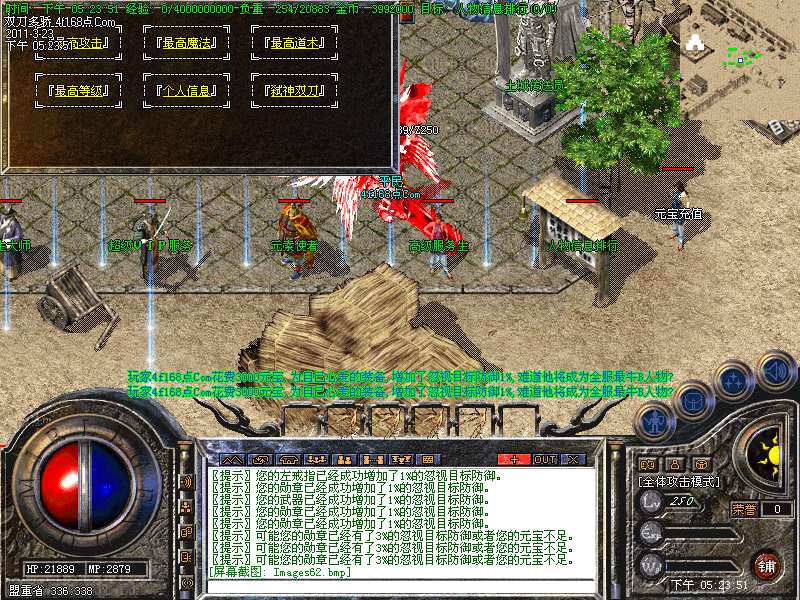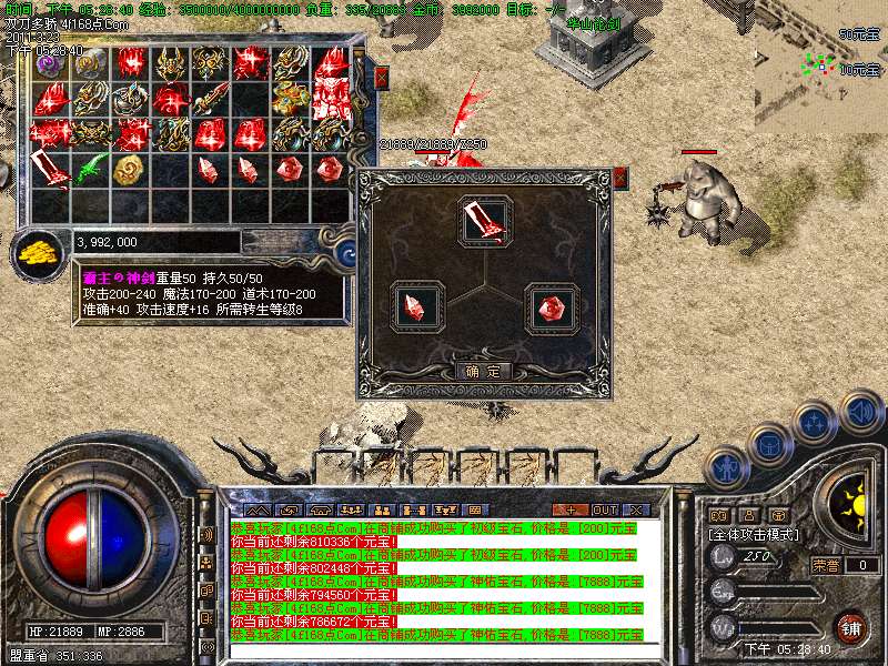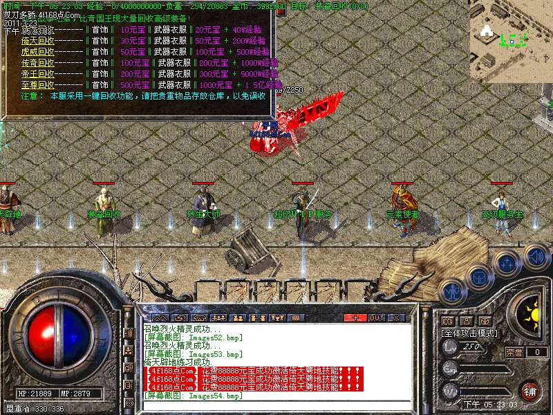 元宝获取:充值元宝送积分换取道具,也可以通过打怪和回收装备获得丰厚的元宝