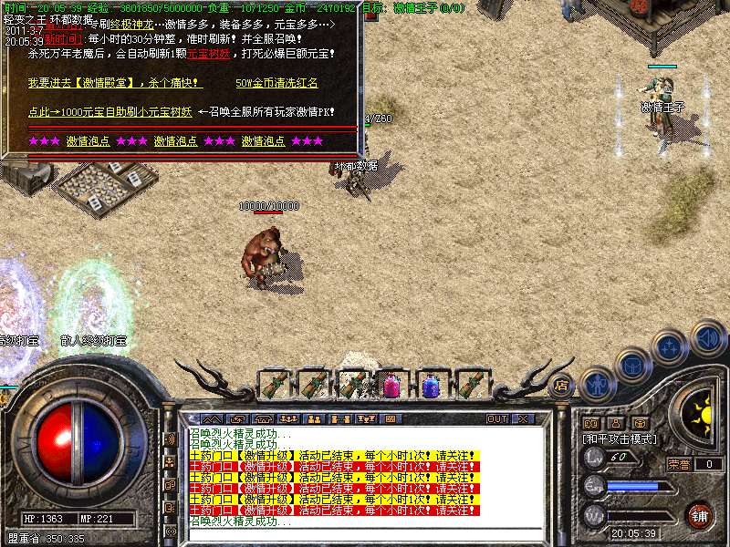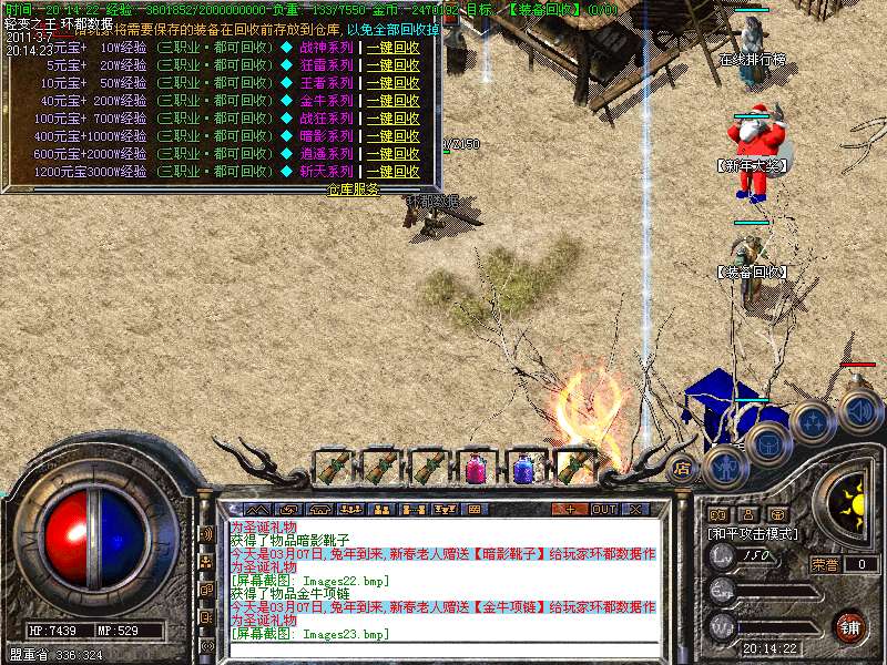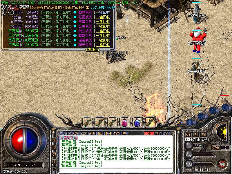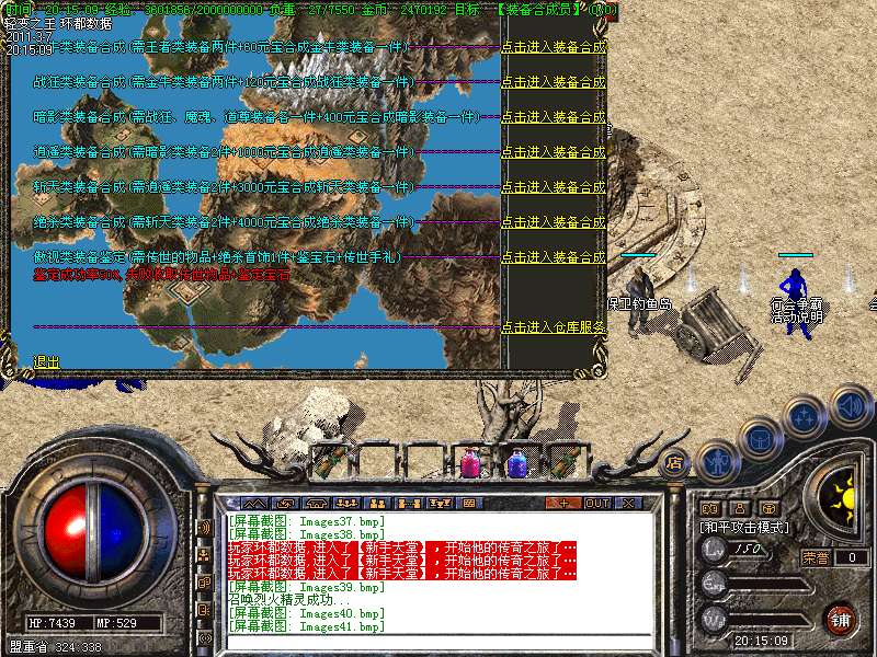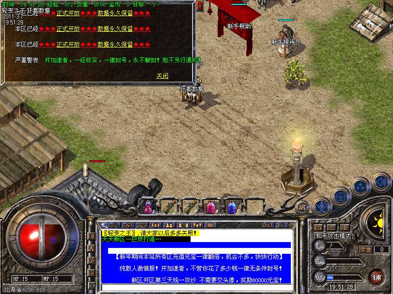 【新手介绍】:非RMB玩家,去[散人激 情打宝]打怪爆装备,可回收大量元宝!可以爆到王者、金牛、战狂、暗影、逍遥装备,斩天装备!新手装备去魔龙城打,练级带3倍经验勋恶魔广场,疯狂练级!