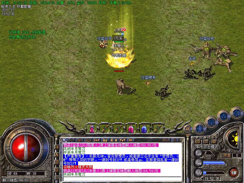 【新手介绍】:非RMB玩家,去[散人激 情打宝]打怪爆装备,可回收大量元宝!可以爆到王者、金牛、战狂、暗影、逍遥装备!新手装备去魔龙城打,练级带3倍经验勋章去疯狂练级
