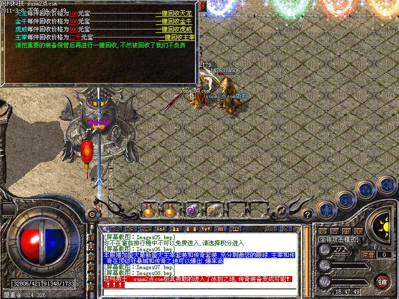 [元宝刷怪]:最新增加元宝刷怪.如果您不想花时间去找怪的话.可以在土城进入元宝刷怪地图.分为单人地图和多人地图.尽情刷怪获得顶级装备