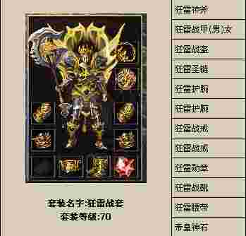 装备出处:火龙,精灵装备在龙邪.英雄装备在铁血和完美中爆.<狂雷,逆火通云>装备在完美高级和铁血二爆.想穿帝皇又不想花钱那就去打秒人王或者卧龙庄主!!