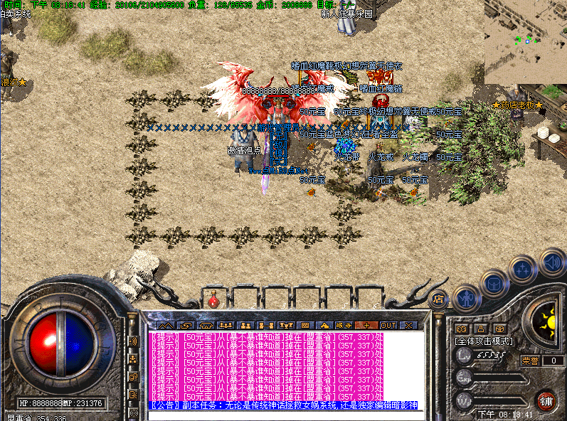 送宝系统:玩家每一个小时,二个小时,三个小时,四个小时,均可在土安全区边免费送元宝处领取在线奖励。