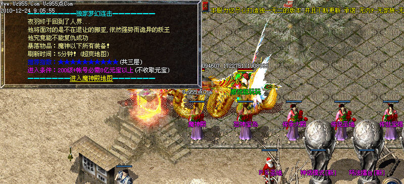 天下第一申请;每天零点自动清理,请玩家去NPC处申请,1.2倍攻击可别让别人抢走咯,还可以领奖哦,(1.2被攻击包括攻击/魔法/道术)(城主为1.3倍)