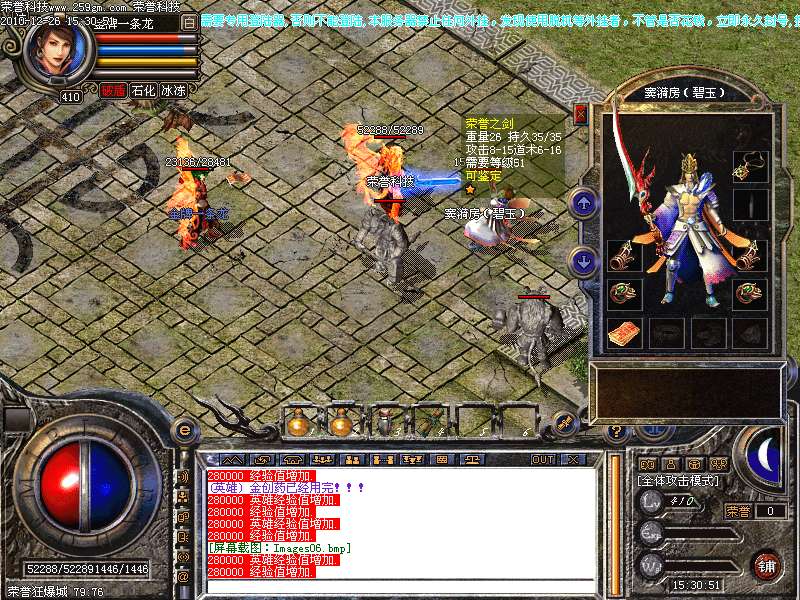 接下来开始游戏赚元宝生涯,祖玛会爆很多祖玛,赤月装备。回收在综合使者地方可以回收装备获得元宝技能书可以用书页在土城左上角的技能合成师地方合成,终极装备各大地图教主都有爆,最近的可以在免费驿站里的“蛋疼教主”也会爆出。9套、屠龙、荣誉之刃不在是梦想,本服升级慢。