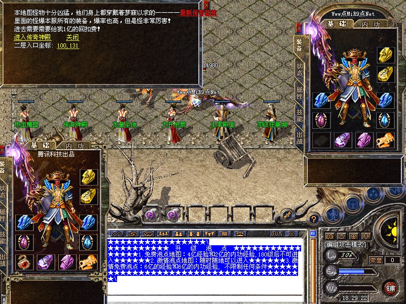 *★★★★★★★★★★ 地 图 介 绍 ★★★★★★★★★★★★★★★★1.新增【大开杀戮】【龙皇圣地】【传奇神殿】【热血魔窟】★★★★★★2.此新增地图绝对可爆全服所有装备装备,包括特殊戒指和物品★★★★★★3.此新增地图全部分为两层,第二层的爆率可比第一层高的多哦★★★★★★4.【顶级狂爆】荣耀风暴虎威装备狂爆,第二层可爆出圣龙装备★★★★★★5.【圣龙殿堂】荣耀风暴虎威圣龙狂爆,第二层可爆出圣龙装备★★★★★★6.【圣龙殿堂】荣耀风暴虎威圣龙狂爆,第二层可爆出圣龙装备★★★★★★7.【战火硝烟】这里是新手的天堂,在这里可以打普通装备回收★★★★★★8.郑重声明,本服所有装备绝对都可以爆出,包括特殊物品,特★★★