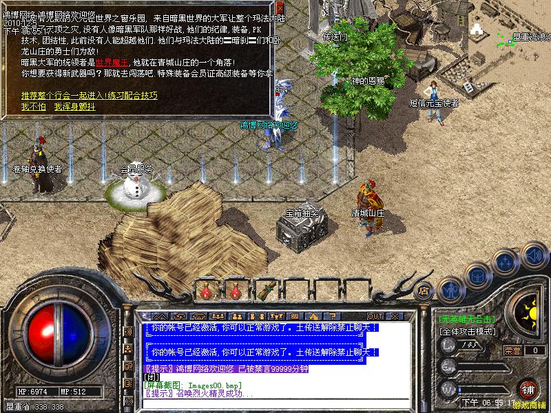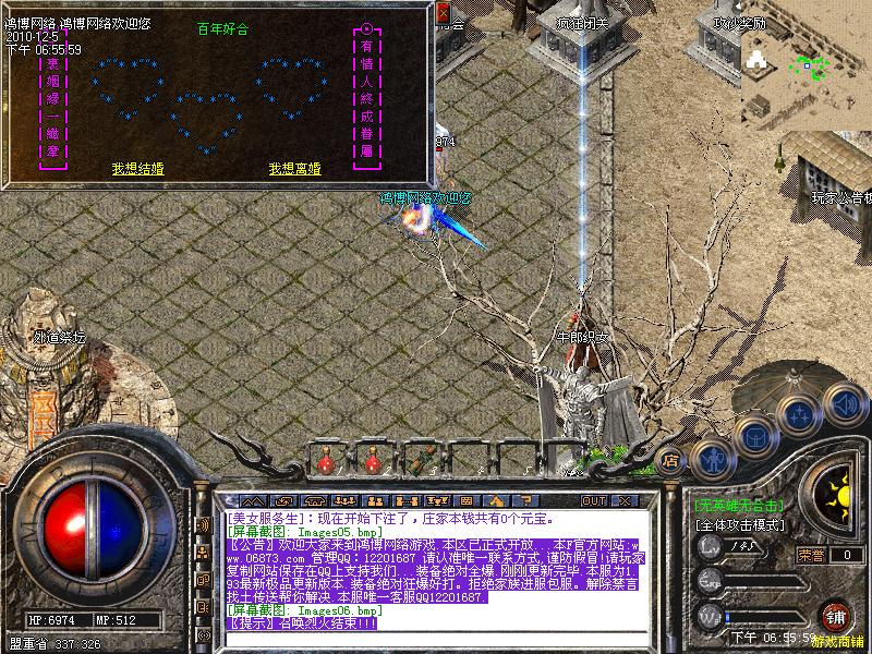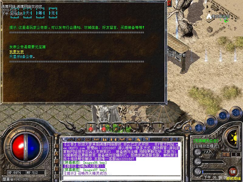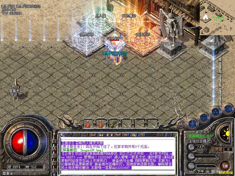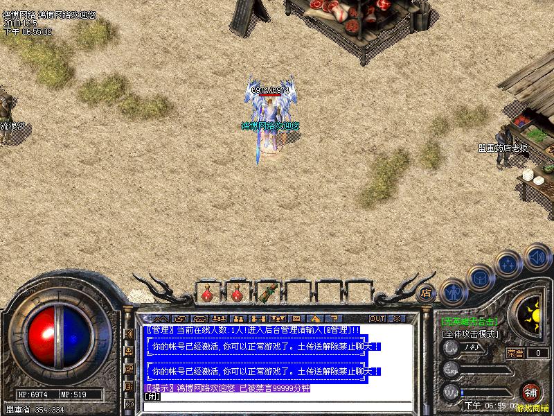 本服务器为:【鸿博网络】,本F已经正式开放了,所有数据都会保留,大家可以尽情的玩!有什么问题随时联系我们的管理QQ:12201687 承诺永不关区!!所有玩家可以自助充值元宝,在土城:343 338 有一个"短信元宝使者",你只要拿起你的手机按照提示发送短信,就可以得到元宝,到屏幕右下方[铺]里购买你想要的东西!