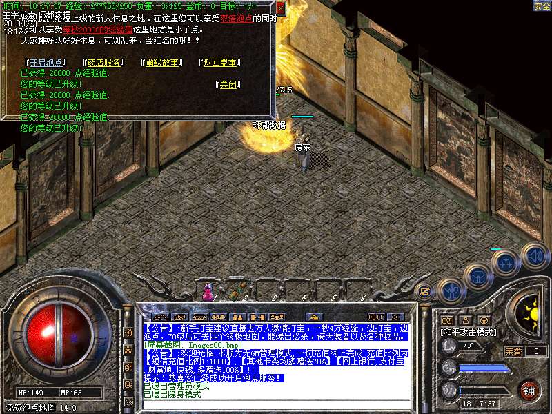 2、新人上线送幸运+9武器,无须打怪,直接进入泡点休息间,瞬间65级,避免打出装备带不上的尴尬
