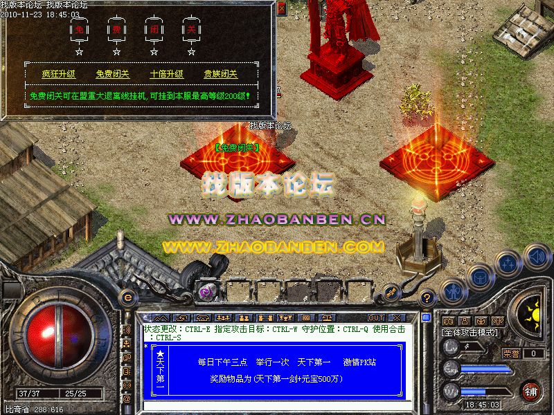*╔─┬───────────────────────────╗│★│ ││闭│ 免费闭关 每秒4000万经验 500万内功 ││关│ 疯狂闭关 每秒6000万经验 4000万内功 ││修│ 恶魔岛★ 每秒4000万经验 2000万内功 ││炼│ 十倍闭关 每秒10000万经验 5000万内功 ││★│ │╚─┴───────────────────────────╝