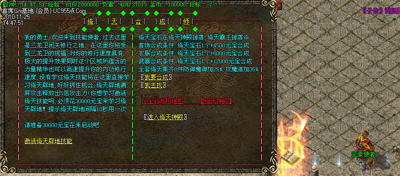 全新技能闪亮登场倚天辟地技能满屏.5倍攻击可以在元宝商铺花30000元宝购买。