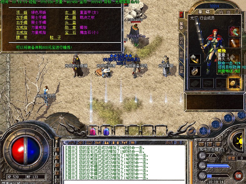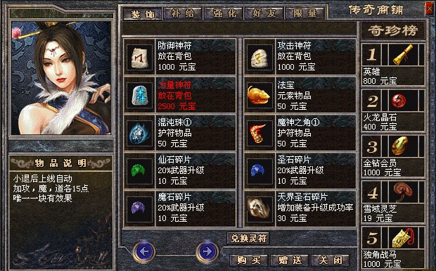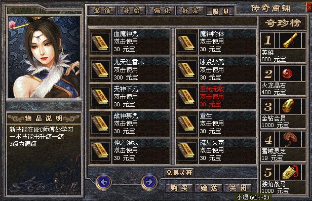 魔神之甲: 根据道术披上魔神甲提高躲避任何攻击的能力,道术越高躲避越强持续越久