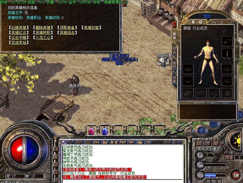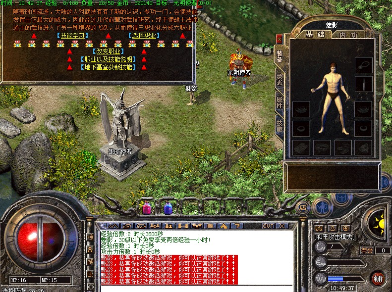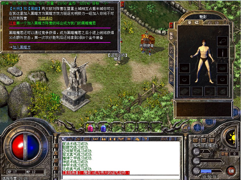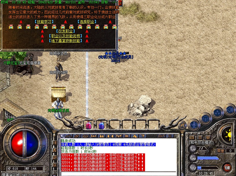 潜行术: 超级隐身技能,使用后一定时间内,怪物人物无法看到,且可以走动和PK