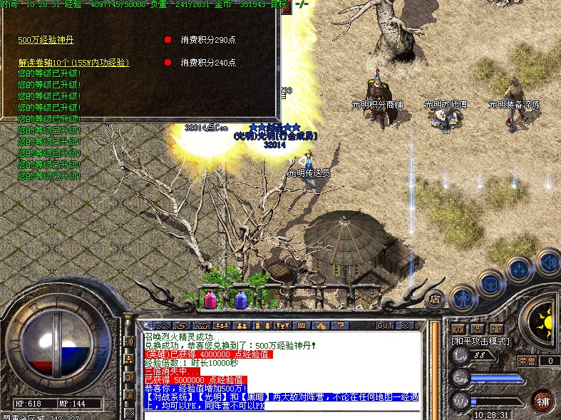神圣召唤: 可以唤出圣光五毒兽,不同的道术召唤不同攻击力的五毒兽(寒冰掌)