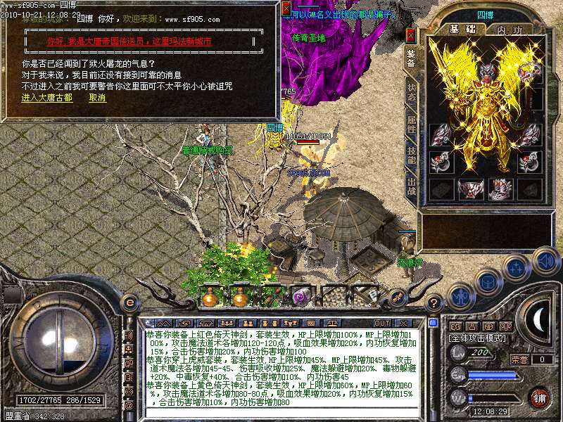 【装备出处】大唐帝国之洛阳城,长安城,秦皇陵墓,主宰圣地,异界魔域装备各地图都有爆,终极丛林BOSS直接爆必杀全套(刺激你的每一根神经,注:有心脏病、高血压的患者远离)
