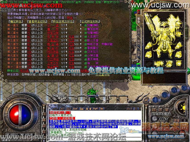 【更新】更新转生系统,1-12转,转生后每转都可以获得相应属性点,另外还设置转生奖励,4-12转可以分别领取各种技能书及超级装备,防麻痹盾牌,1。5倍力量面纱等!!具体土城转生炉处了解!