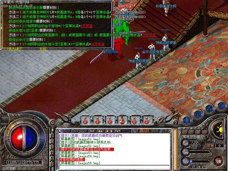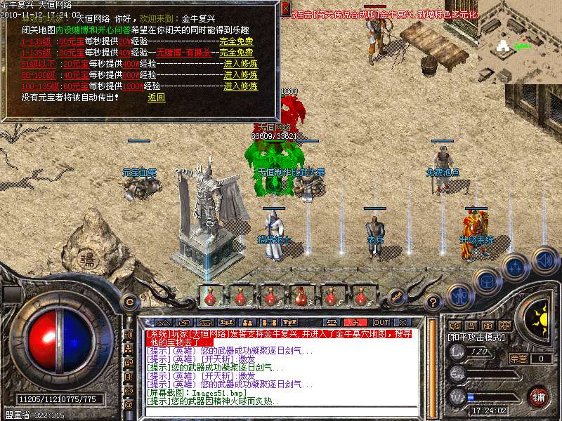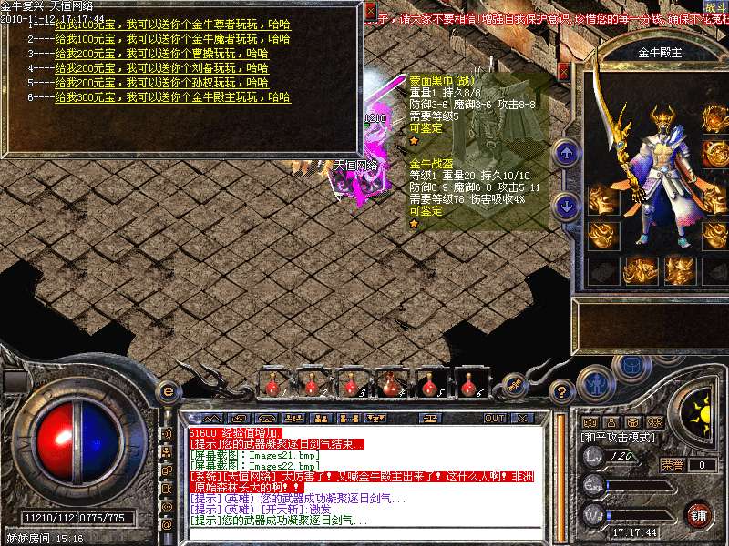 1.版本和盛大同步去掉内功和连击,将1.95和1.85综合而成的无盾,无内功,无连击.所有装备靠打和合成,就金牛神刃和金牛衣服不爆其他全部装备都爆出,只要肯努力就有终级!