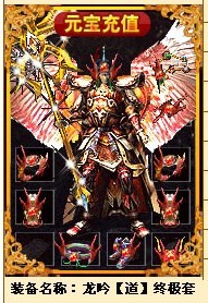 【装备合成】当你累计了一定数量的装备后可合成 更高一级的装备.比如2只(雷霆战戒)可以合成(雷霆战戒①).合到第十次为(雷霆战戒<终极>终极).第十一次为(龙吟装).这种玩法可以让你玩上一两年也不会烦腻.装备好爆.练级容易.