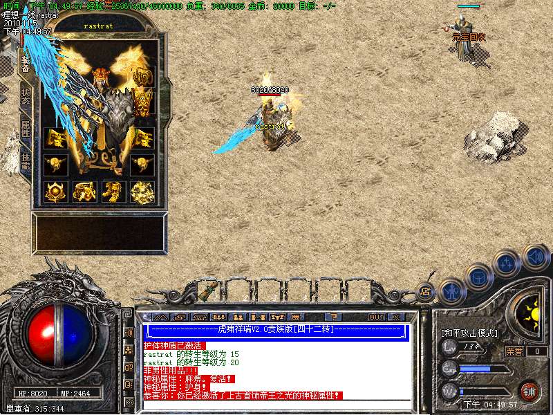〖提示〗:新手请到土传送员进入 装备圣地 练级圣地 技能圣地 新手2小时绝对可以5转以上 练级圣地怪物掉落10-500不等元宝.新手不会再为元宝发愁咯!