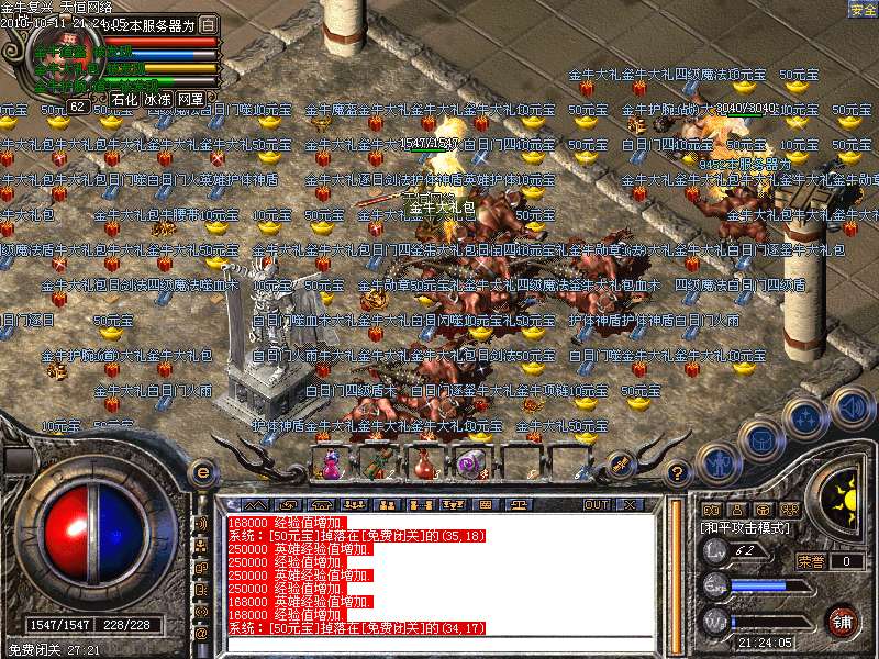 4.激情修炼每30分钟2只BOSS送出大量元宝和终极装备,富豪宝藏四大护法、主宰魔王爆率是你永远想不到的高!