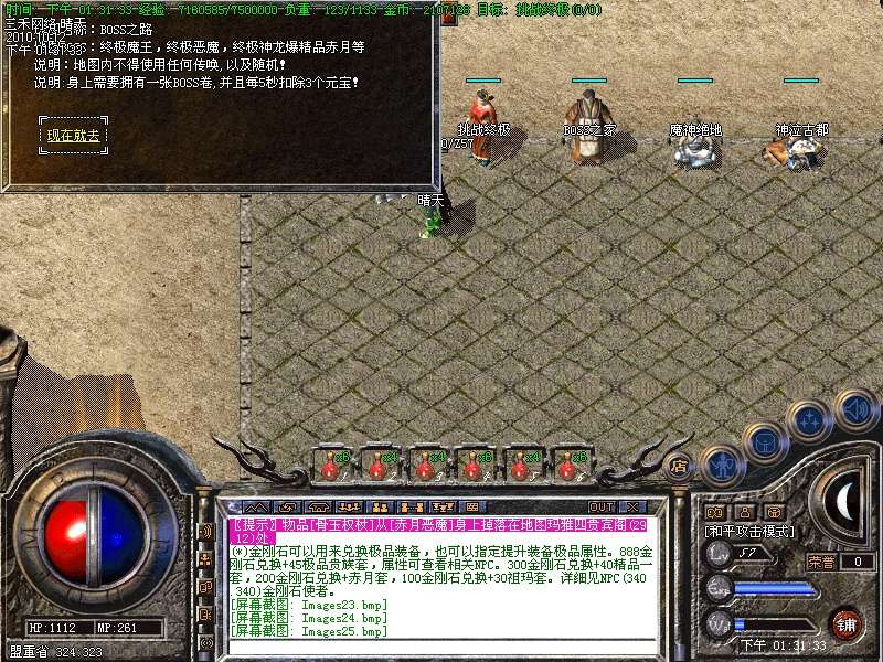 〖版本介绍二〗:金刚石可以用来兑换极品装备,也可以指定提升装备极品属性。888金刚石兑换+45 极品贵族套,属性可查看相关NPC。300金刚石兑换+40精品一套,200金刚石兑换+赤月套,100金刚石兑换+30祖玛套。详细见NPC(340.340)金刚石使者。