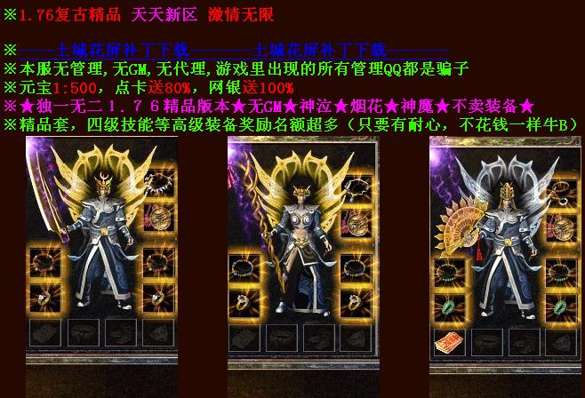 【公告】:本服无任何GM在线!!所有玩家一律网站充值!!游戏中刷喇叭出售元宝的QQ均为骗子!!!