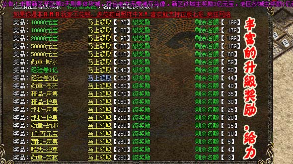 【沙城奖励】本服新区开区第2天则集体攻城,行会老大无需递交头像,新区沙城主奖励3亿元宝,老区沙城主奖励1.5亿元宝。