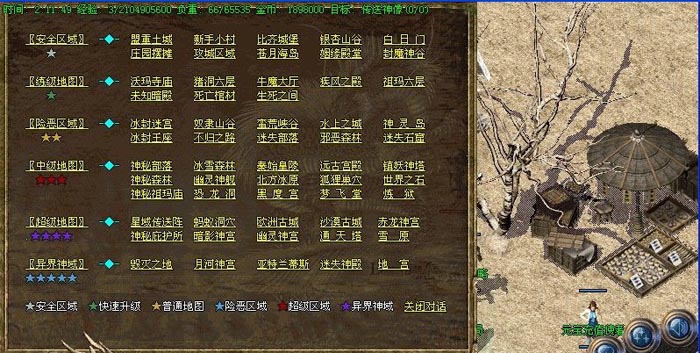____三、贵族会员地图 刷新时间比黄金会员图稍快,boss也比黄金会员多,爆率依然看人品,主体怪物都差不多。 四、欧洲古城 欧洲古城依然会刷新古代兽王以及未知教主,爆率看人品,新手们注意,古代兽王是有几亿的经验的,新手们运气好打掉一个的话,呵呵,很爽的。 五、雪原 雪原2层和3层 都会刷新boss, 但是爆率不是很高,不推荐。 六、月河以及暗影神宫、 里面的小怪也会爆150-170.的装备,2层里面有boss.月河领主。土城安全区、新增加副本地图、一共7层、每一层都拥有全新BOSS、绝对会爆出全F终极装备、而且最后一层可以领取神灵之石一块、(神灵之石在土右上随机换取装备一件.神器也会出噢、看运气、).各BOSS刷新地点。 一、黄金boss地图 以及boss之家 两个半小时刷新一次,里面有通天教主,未知教主,古代兽王,瑟德兰克领主、等等.....会爆出本F所有装备。而且还包括终极神器噢、毁灭之地 刷新时间可能半小时左右,里面boss都很强力,不建议新手们去。依然会爆所有装备。贵族会员地图刷新时间比黄金会员图稍快,boss也比黄金会员多,爆率依然看人品,主体怪都差不多