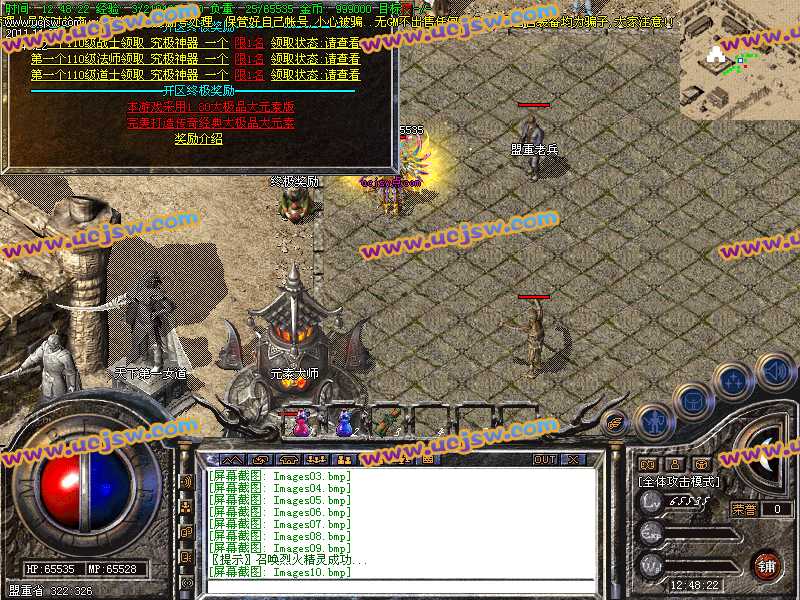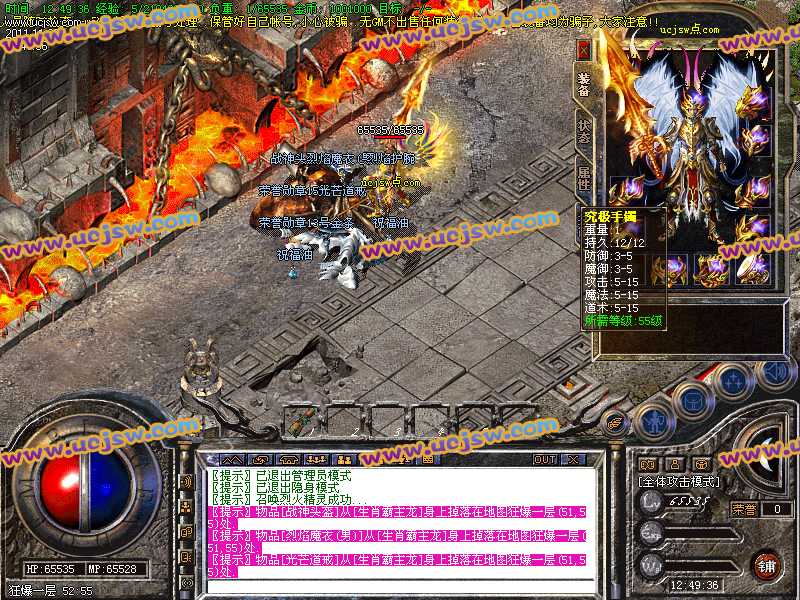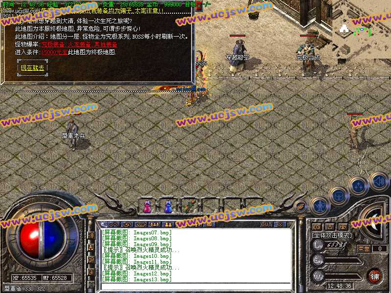 【特色⒉】:狂暴之泉,皇宫大殿,层次越深,暴率越高.唯一可暴出新装备→究级套装的地图!四级技能2小时开放一次,天下第一称号可获1.2倍攻击,天神戒,死神戒均为1.2倍攻击属性!!