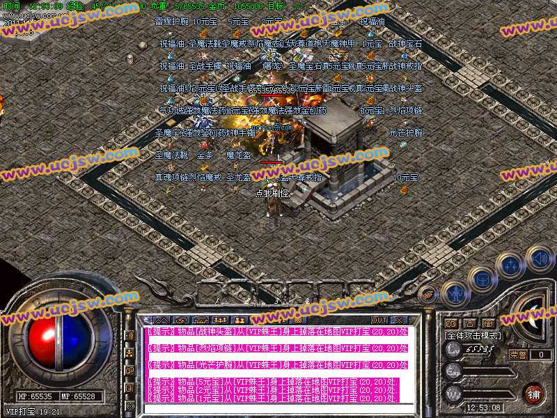 【特色⒋】:VIP打宝地图可以单人进入可组队进入,里面刷的BOSS可暴本服所有装备,和技能.暴率相当高!!!