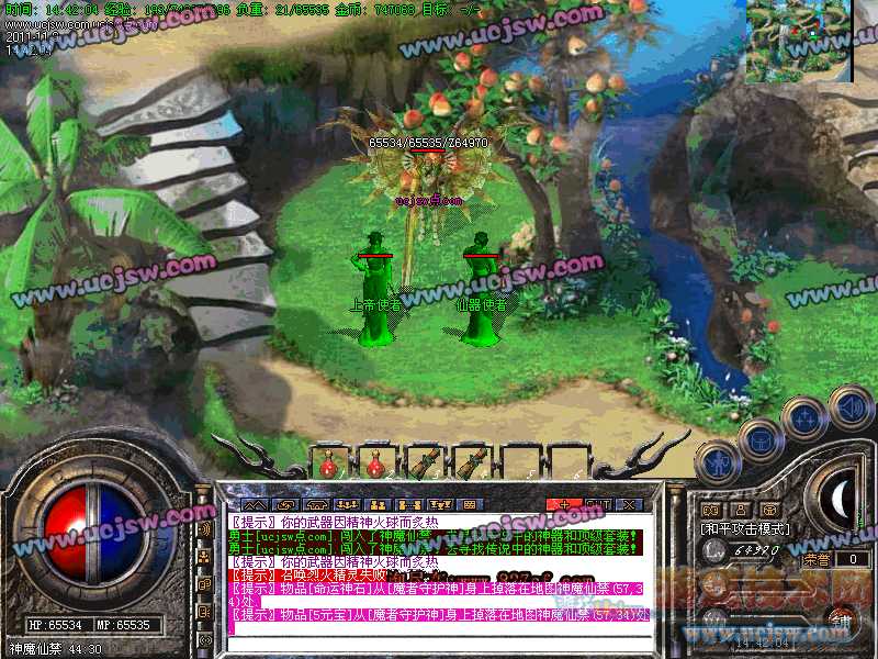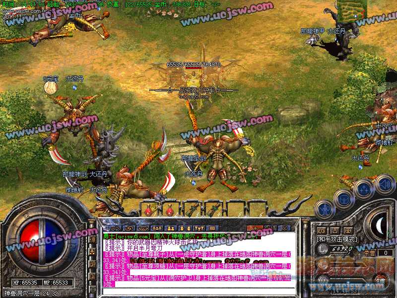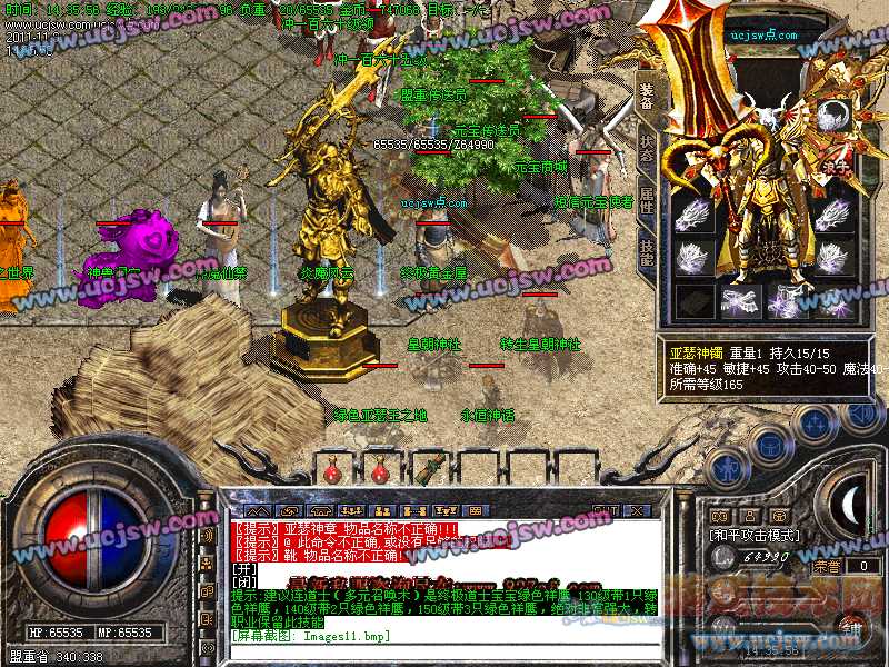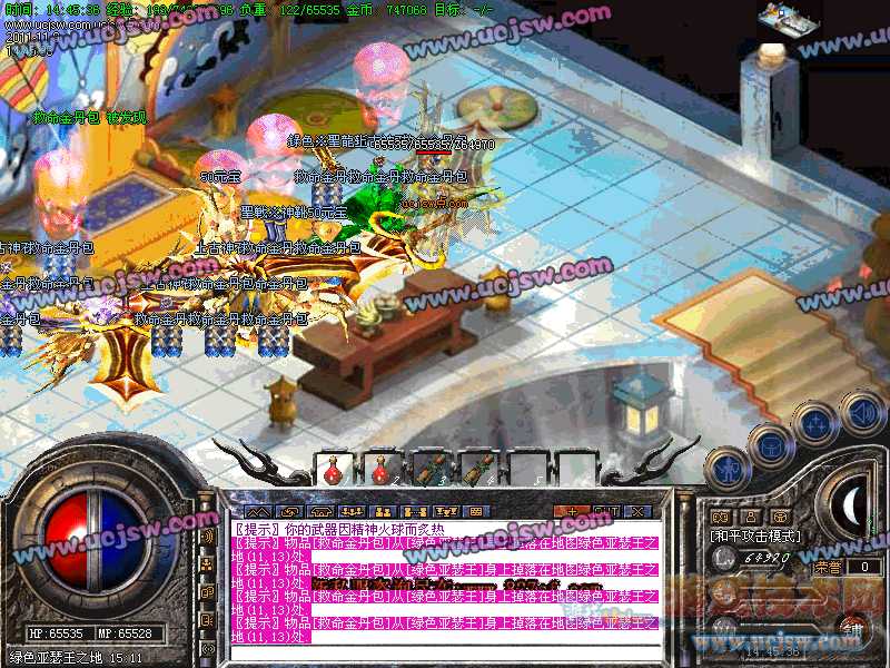 八.【特殊刷新】:用魔法神石在土药旁边的魔法结阵可召唤出蚩尤.同时可获得丰富的奖品.--即本服的所有装备都可送出!