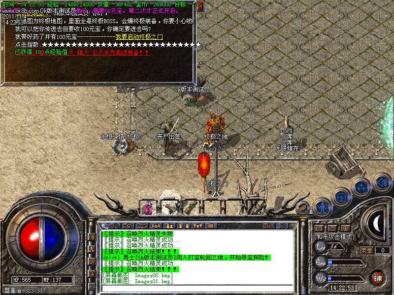 <5>:高级BOSS出4大神技书页,凑齐4个字可以合成,书页可以打高级BOSS爆出.增加法师神技分身术,加强法师的生存和PK.尸王大殿每一个小时刷新一只宝石使者可以爆强化宝石!