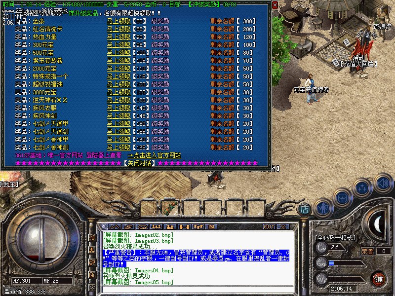 三.【特色活动】每天一次的活动.斩杀任意怪物500只可获得500元宝的奖励.元宝自动增加在身上.注意查收!