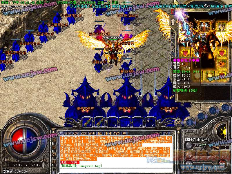 八.【特殊刷新】:用魔法神石在土药旁边的魔法结阵可召唤出蚩尤.同时可获得丰富的奖品.--即本服的所有装备都可送出!