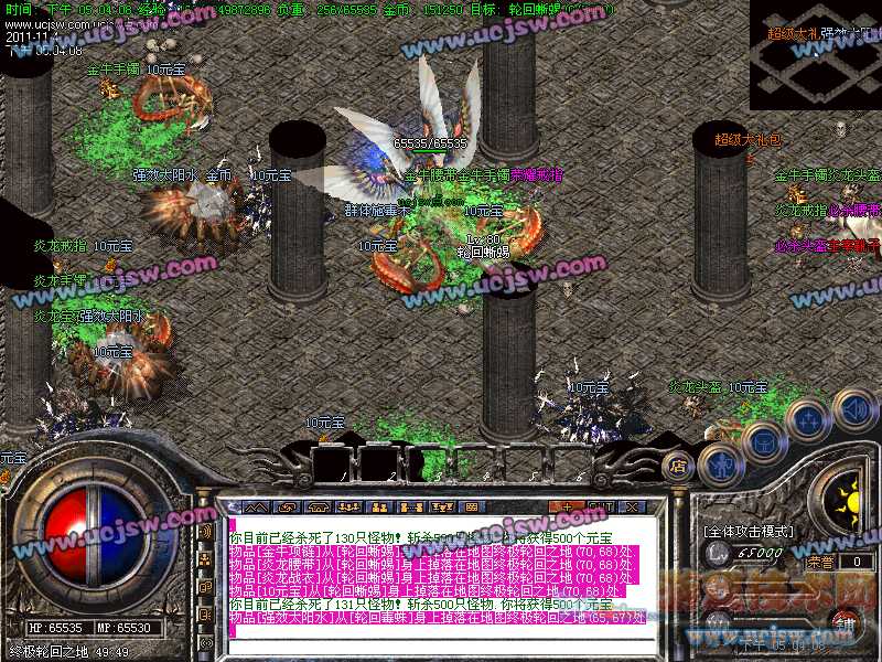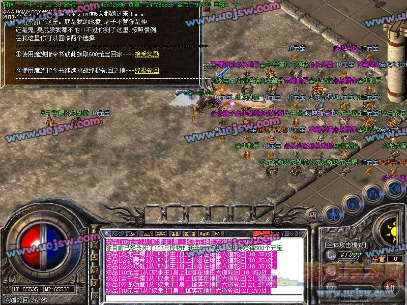 四.【特别地图】:六道轮回,共七层,每进一层难度不通,闯过六层可以领取500元宝奖励,或者进入终极轮回之地挑战终极BOSS,此地图暴率非常高!