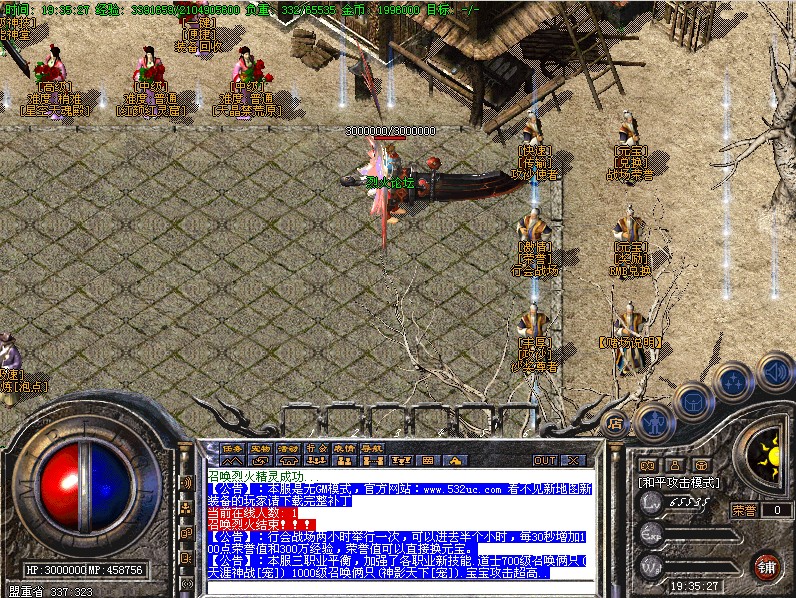 【公告】:行会战场两小时举行一次,可以进去半个小时,每30秒增加100点荣誉值和300万经验,荣誉值可以直接换元宝。