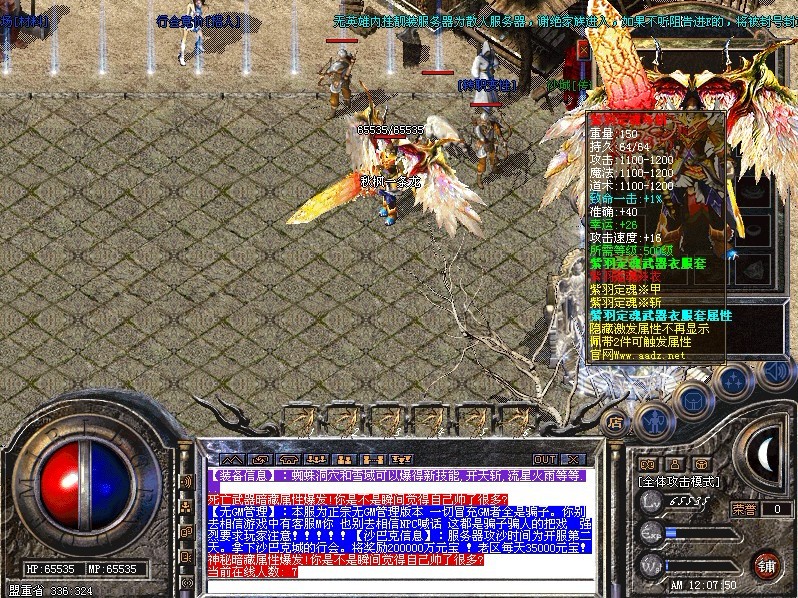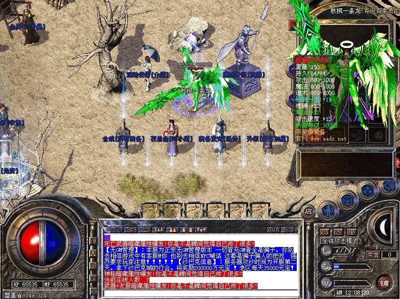 【无GM管理】:本服为正宗无GM管理版本 一切冒充GM者全是骗子。你别去相信游戏中有客服M你 也别去相信NPC喊话 这都是骗子骗人的把戏 强烈要求玩家注意!!!!!【沙巴克信息】:服务器攻沙时间为开服第二天。拿下沙巴克城的行会。将奖励200000万元宝 !老区每天35000元宝!