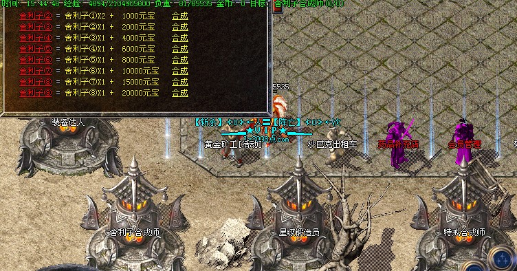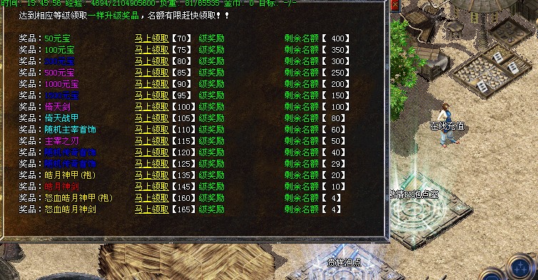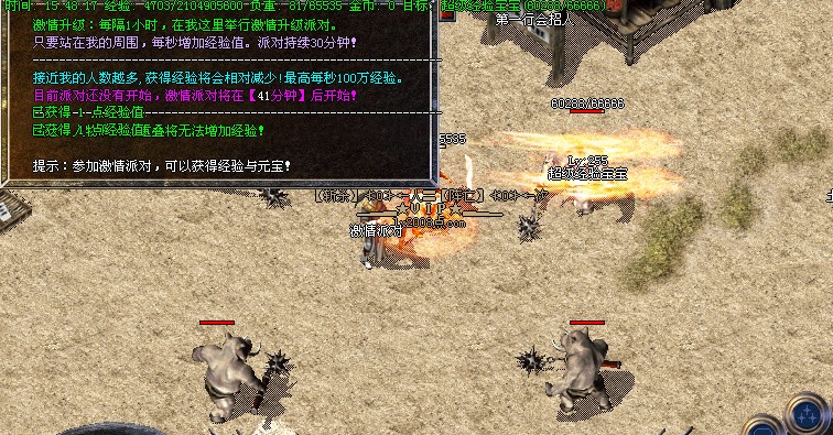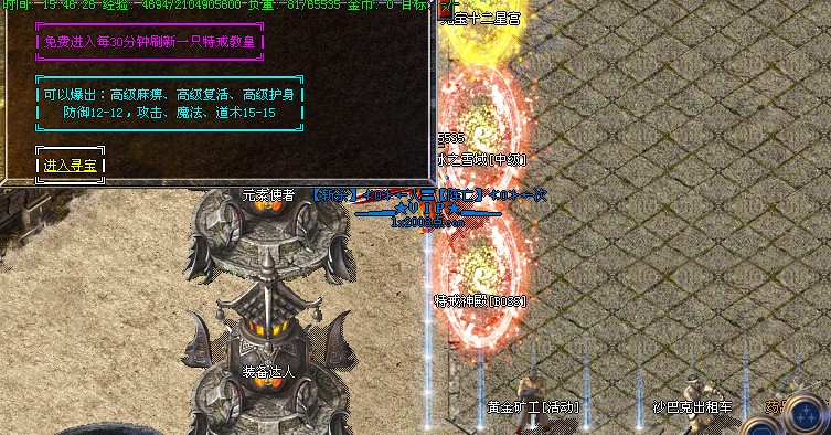 【活动】每2小时系统自动提示获得 <黄金矿工> 可以挖出、元宝、经验、装备。每20分钟刷出元宝树,必爆5000元宝,每小时系统传送杀鸡活动,其中一只爆高级装备,后续将增加杀人比赛,敬请期待