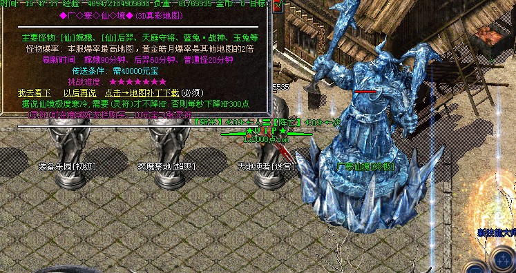 【地图】隆重推荐两大地图→广寒仙境:全新3D真彩地图,怪物超猛,黄金装备爆率很高,是打装备好去处。当然进这两地图得有其他地图的装备做基础。