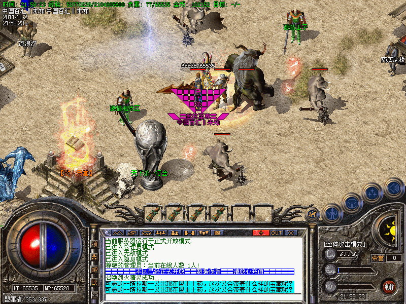 八.【特殊刷新】:用魔法神石在土药旁边的魔法结阵可召唤出蚩尤.同时可获得丰富的奖品.--即本服的所有装备都可送出!