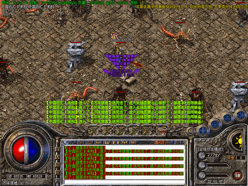 五.【特别地图】:抗日战场,进入等级需要85级,里面怪物刷新快,爆率高,装备好,想获得好装备的。是你的必进之地!【此地图最新添加人形怪,传奇,主宰,必杀,元宝爆率超高】