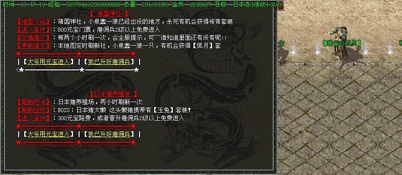 22.抗日战场,进入等级需要85级,里面怪物刷新快,爆率高,装备好,想获得好装备的。是你的必进之地!【此地图最新添加人形怪,主宰,必杀,元宝爆率超高】